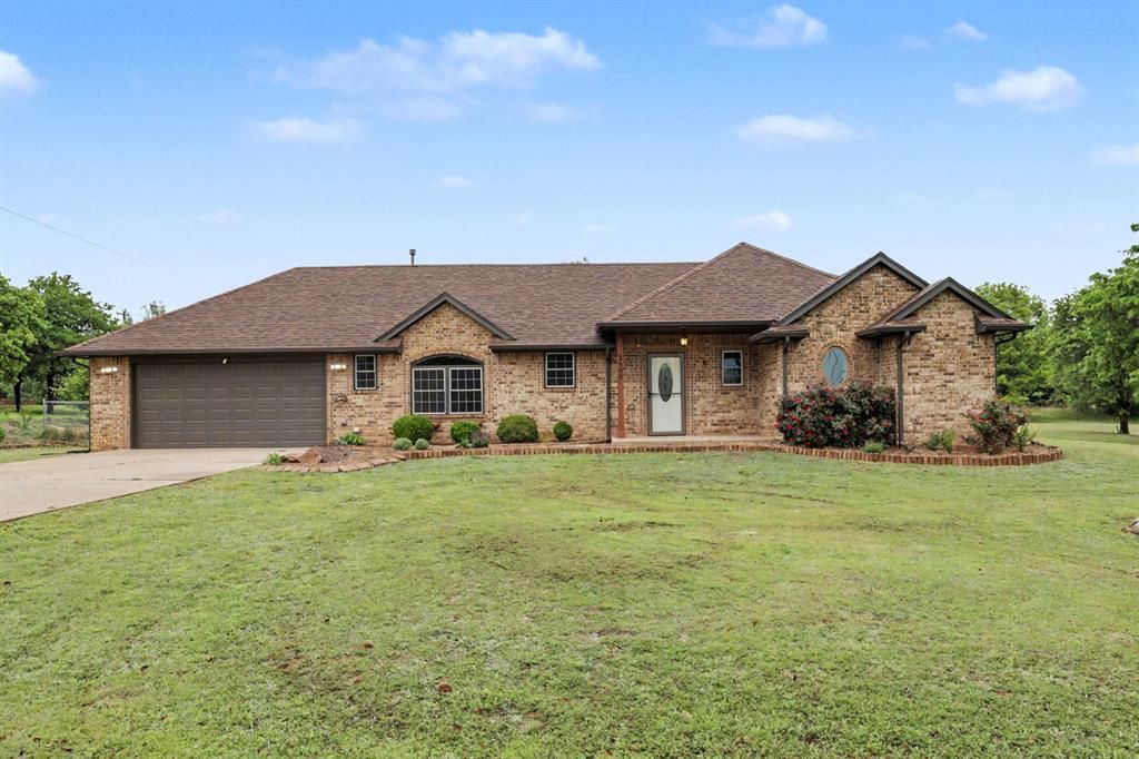 Tucked away on a quiet cul-de-sac street this home sits on a 1.3 acre wooded lot. 3-bedoom, 2-bath home built in 2004 has fresh paint inside and out, vinyl planking and tile throughout-(no carpet!), updated windows and roof was installed in 2023. The kitchen has stainless appliances, granite counters, and a tile backsplash. The baths have new toilets, plumbing fixtures, and lighting. The crisp paint color, LED lighting, ceiling fans, new door and cabinet hardware gives the home a fresh feel. The large backyard is partially fenced with a chicken coop, 10X12 storage shed, raised garden beds and decorative pond just off the pergola covered patio. You will appreciate the storm shelter, full gutter wrap, 500 gallon propane tank, trimmed trees and beds freshened. Logan Co. water and located in the Guthrie school system. 4 miles to I-35 and Waterloo Road.